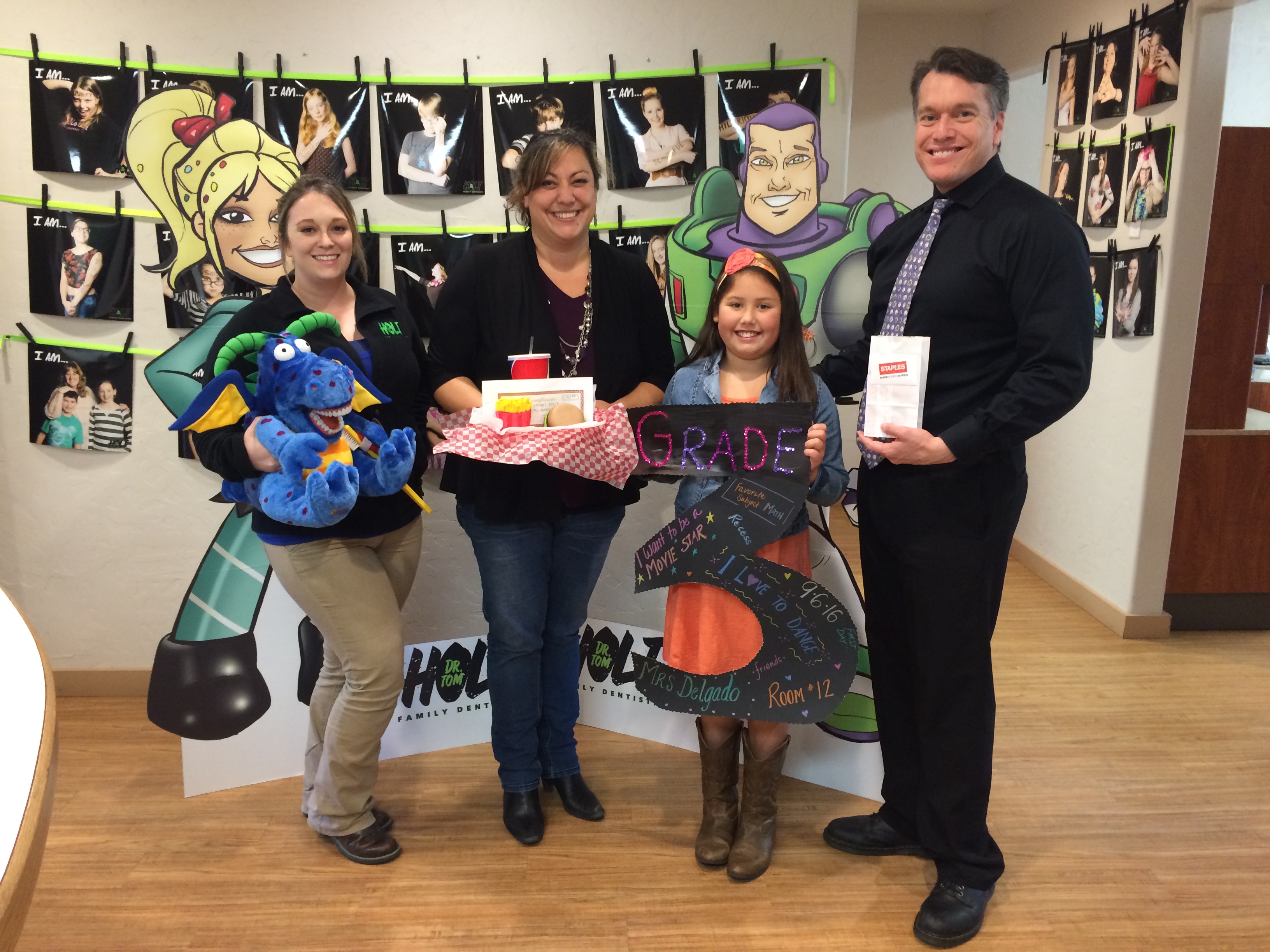 Without further delay, we are proud to announce the winner was the lovely Candi and her cute as a button daughter! We were more than happy to welcome her to the practice to accept her prize and her classroom's prize. We hope her 3rd grade class all gets to enjoy the new school supplies.